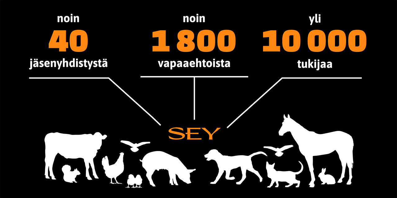 SEY Suomen eläinsuojelu on Suomen suurin eläinsuojelujärjestö ja eläinsuojelun asiantuntija. Olemme toimineet suomalaisen eläinsuojelun eturintamassa jo yli sadan vuoden ajan. Olemme saaneet paljon aikaan. Se on paras mahdollinen todiste siitä, että muutos parempaan on mahdollinen jatkossakin.